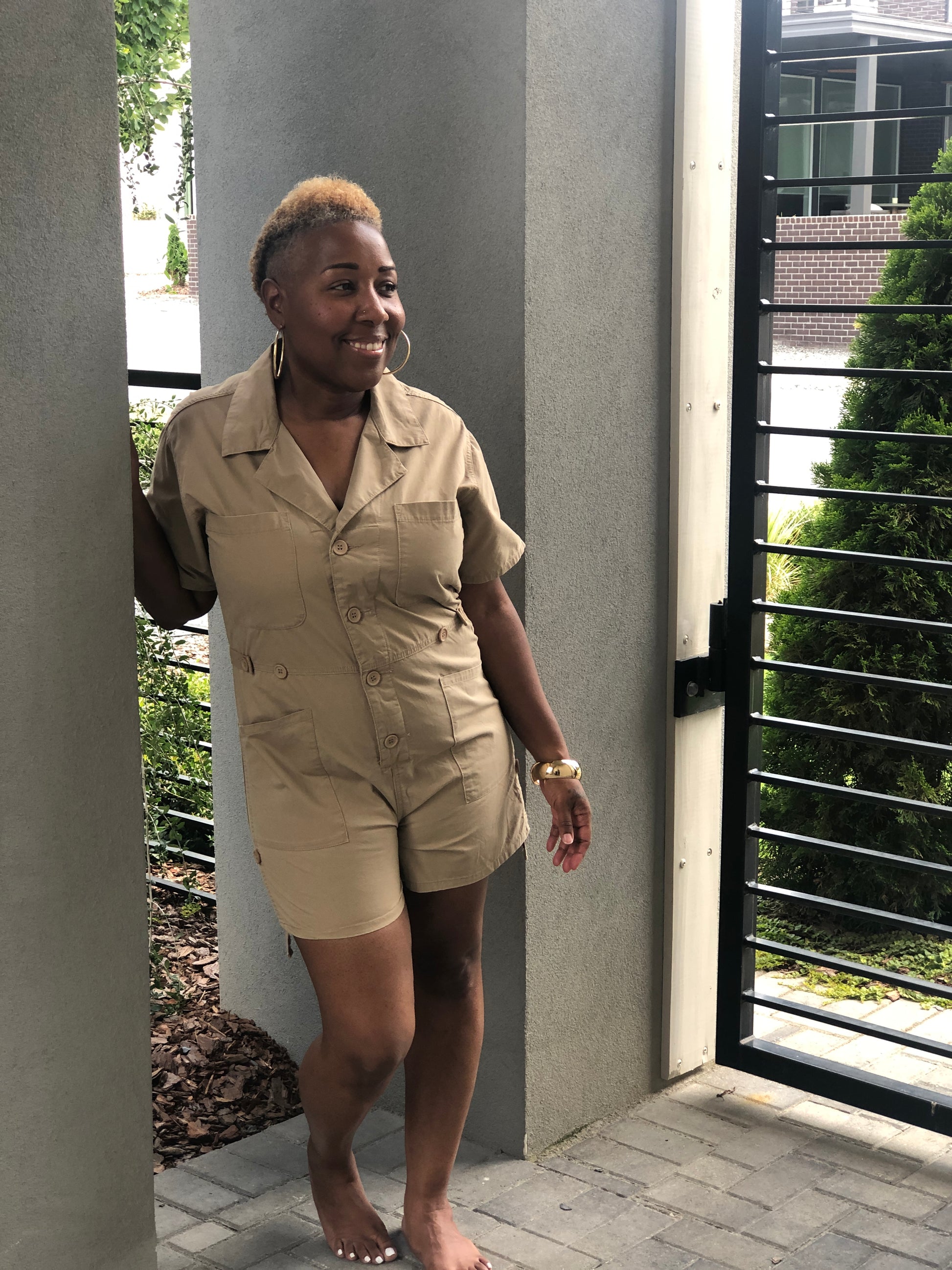 Woven cotton, snap closures with buttons, adjustable tabs at the waist, and hem with utility pockets. This romper is not only cute and comfortable but perfect for weekend missions.