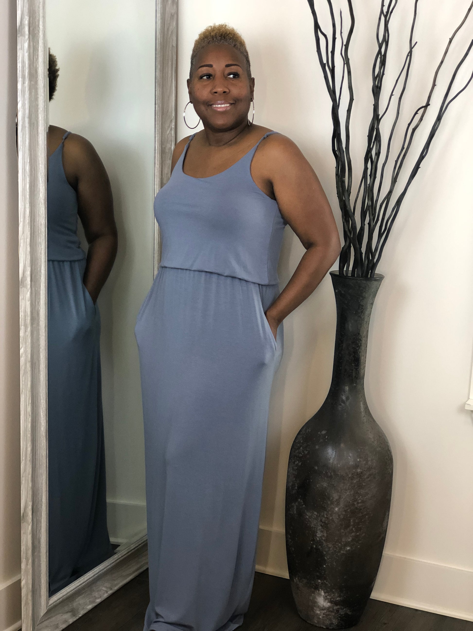 Two-layer maxi dress, with pockets and adjustable straps. This dress flows with you. Make a statement and stand out in the crowd with this head-turner.